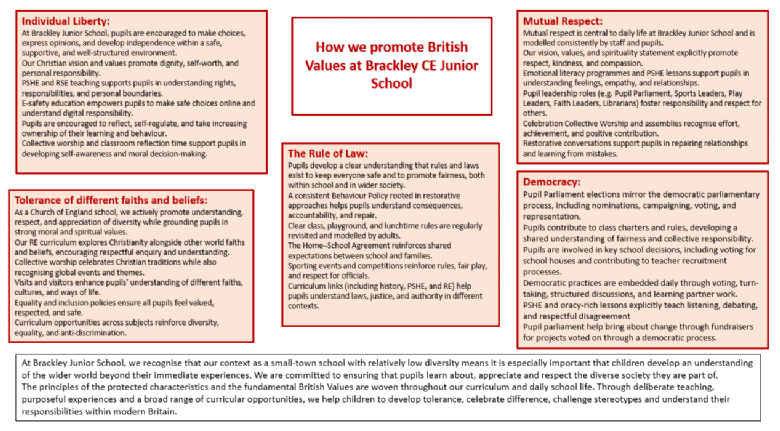 At Brackley Junior School, we recognise that our context as a small town school with relatively low diversity means it is especially important that children develop an understanding of the wider world beyond their immediate experiences. We are committed to ensuring that pupils learn about, appreciate and respect the diverse society they are part of.